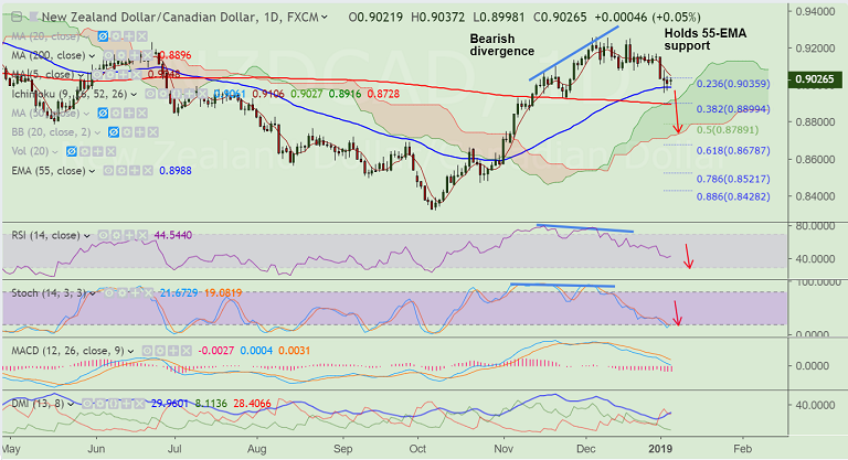 - Break below 55-EMA to see dip till next bear target at 200-DMA at 0.89. Violation there will see test of 61.8% Fib at 0.8678.