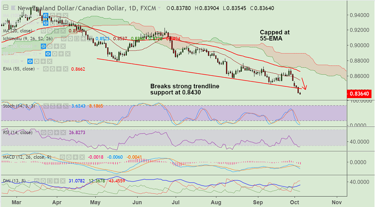 - The pair is trading with a strong bearish bias. Scope for test of Aug 2015 lows at 0.8234.