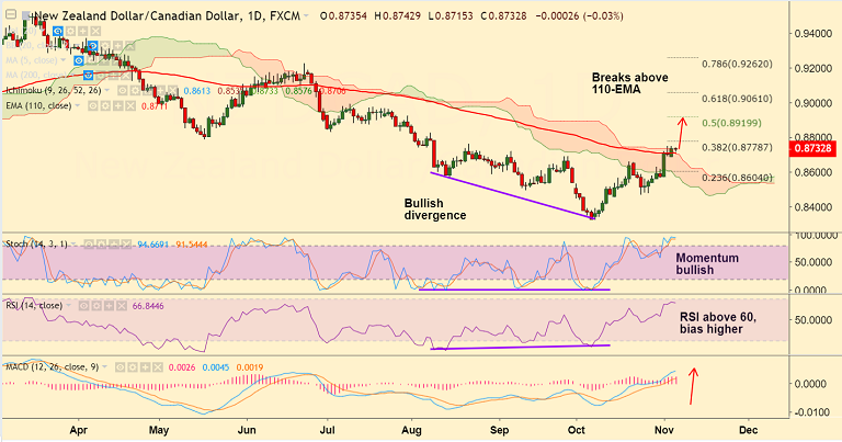 - The pair has broken above daily cloud and 110-EMA and is on track for further gains.
