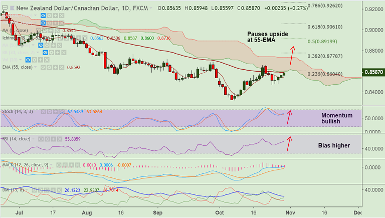 - The pair has paused upside, finds stiff resistance at 55-EMA and daily cloud at 0.86.