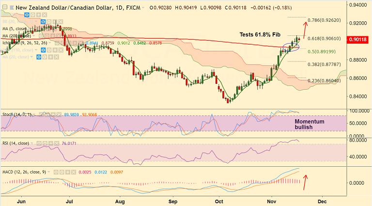 - NZD/CAD is trading 0.32% lower on the day after opening with a bearish gap.