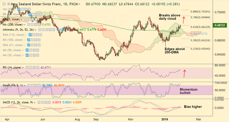 - NZD/CHF shows breakout at daily cloud, bullish momentum could see further gains.
