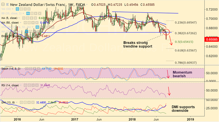 - NZD/CHF extends channel breakout, trades 0.24% lower on the day at 0.6556 at the time of writing.