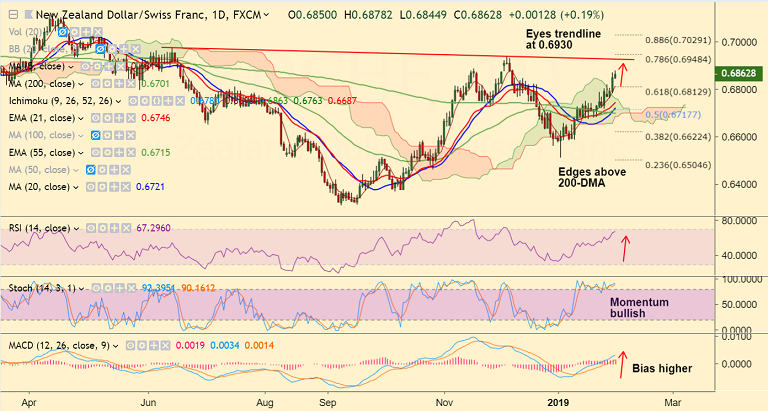 - On the flipside, immediate support is seen at 5-DMA at 0.6814. Break below 200-DMA negates bullish bias.