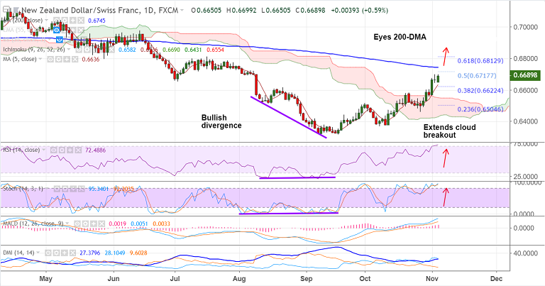 - NZD/CHF is extending cloud breakout, trades 0.45% higher on the day at 0.6696 at the time of writing.