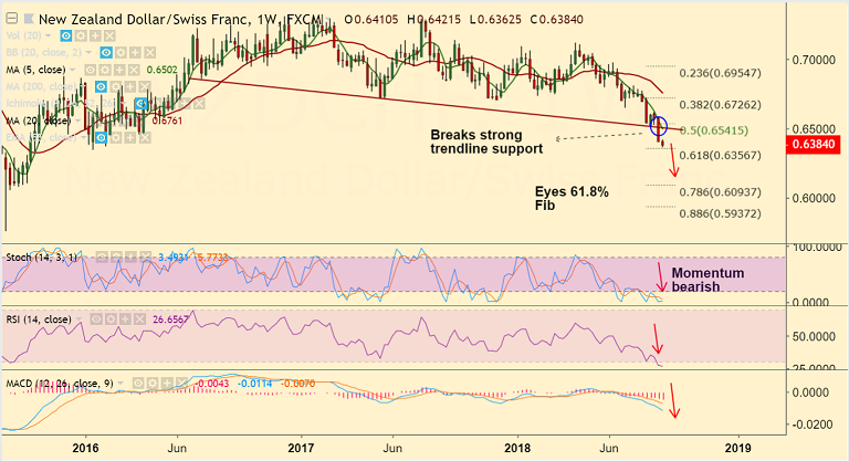 - NZD/CHF slips lower to hit new 31-month lows at 0.6362, eyes 61.8% Fib at 0.6356.