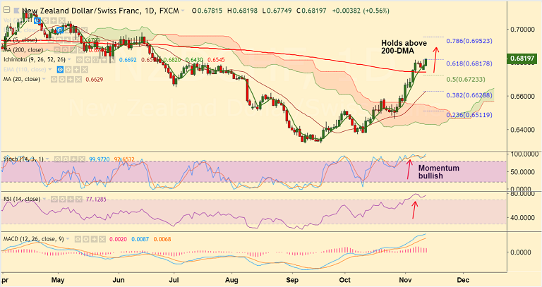 - NZD/CHF is trading 0.55% higher on the day at 0.6818 at the time of writing.