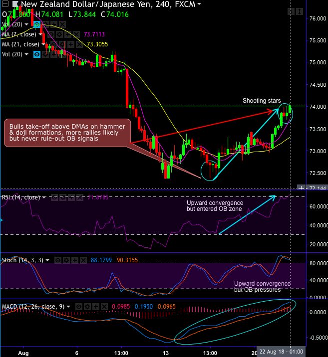Well, Bulls of this pair take-off above DMAs on the bullish candlestick formations, for now, rallies seem to be most likely but never rule-out overbought (OB) signals.