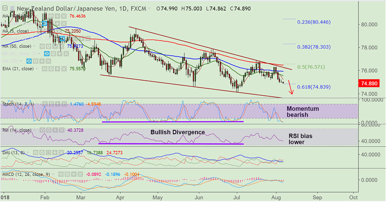 Recommendation: Good to go short on break below 61.8% Fib, SL: 75.20, TP: 73.60/ 73/ 72.40