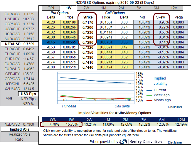 Buy NZD/USD 2w put strike 0.7250 knock-out 0.70, indicative offer: 0.45% (vs 0.84% for the vanilla, spot ref 0.7320). As it sells convexity and volatility, this trade is intended to be a buy-and-hold position. The maximum leverage will be reflected in the market value only a few days before the expiry. In addition, volatility is likely to go up along with NZD weakness, suggesting getting rid of the vega related P/L and targeting only the option pay-off.