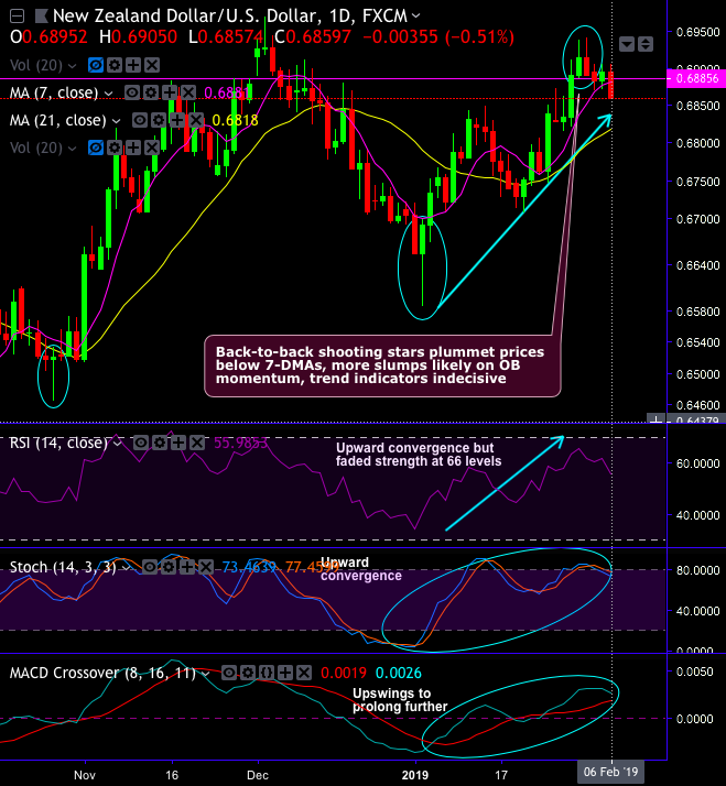 Technical Chart And Candlestick Patterns: NZDUSD has formed back-to-back shooting stars at 0.6914 and 0.6890 levels that plummet prices below 7-DMAs. For now, extensions of slumps seem to be most likely upon on intensified selling interests signaled by both leading oscillators on the daily timeframe.