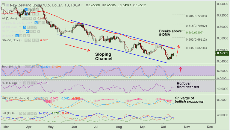 Support levels - 0.6497 (5-DMA), 0.6424 (Oct 8 low), 0.6340 (channel base)