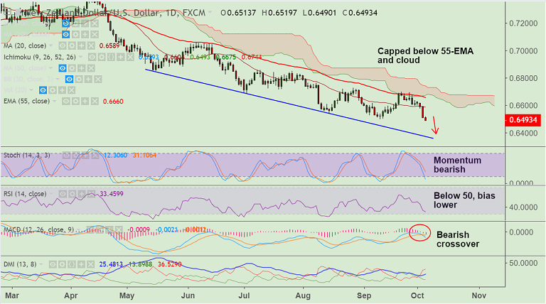 - The major has slipped below 0.65 mark to hit 2-1/2 year lows at 0.6489, bias still bearish.