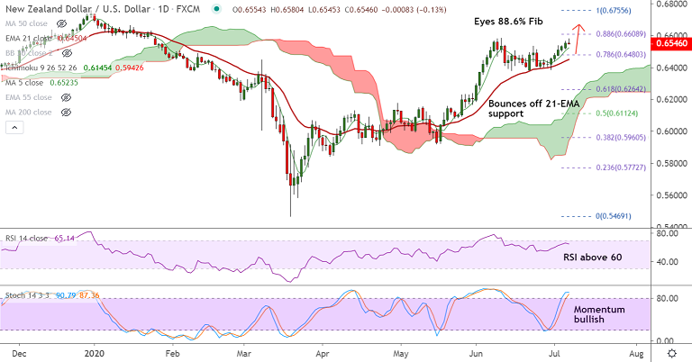 21-EMA is strong support at 0.6450. Break below could see dip till 200-DMA. Violation at 200-DMA negates bullish bias.