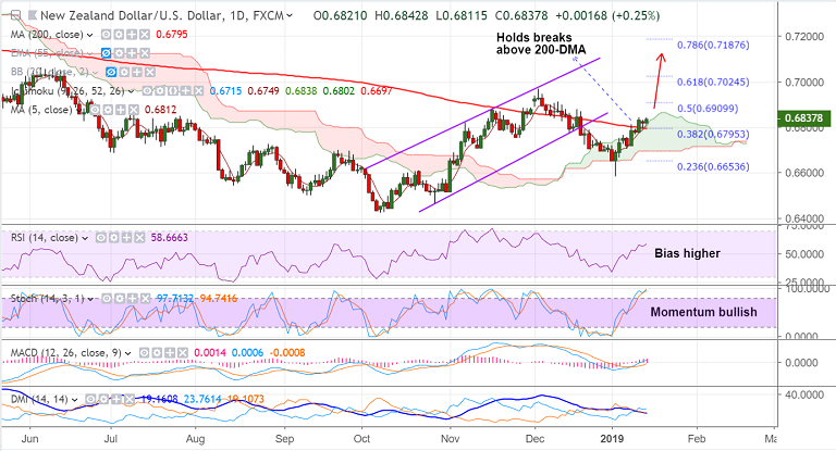 - NZD/USD is consolidating a break above 200-DMA, momentum remains bullish.