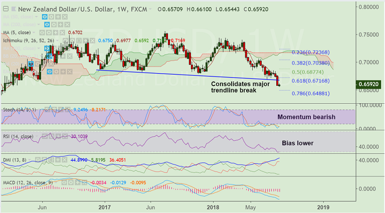 - NZD/USD is consolidating break below major trendline support at 0.6685.