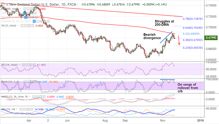 - NZD/USD fails to break above 200-DMA, slips below 5-DMA on Tuesday's trade.