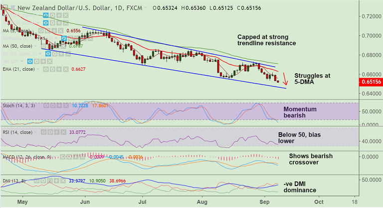 - The major trades with a strong bearish bias, eyes channel base support at 0.6470. Breach there could see further weakness.