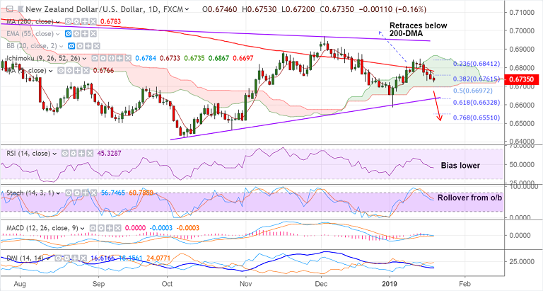 - The pair is grinding lower below 200-DMA resistance, trades 0.17% lower at 0.6728 at 0330 GMT.