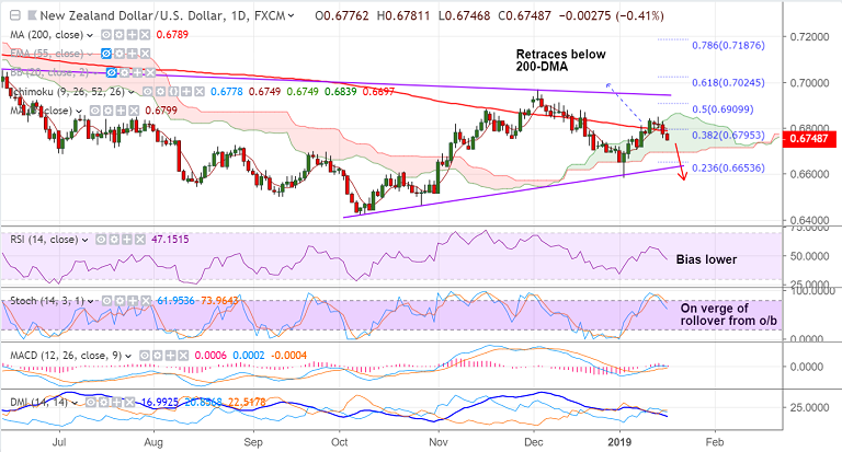 - NZD/USD has failed to hold break above 200-DMA, slips lower to currently trade at 0.6744.