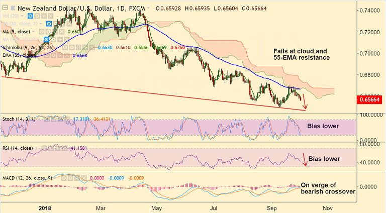 - We see scope for dip till 0.6480 (trendline support). Violation there could see further weakness. Bearish invalidation above 55-EMA at 0.6672.