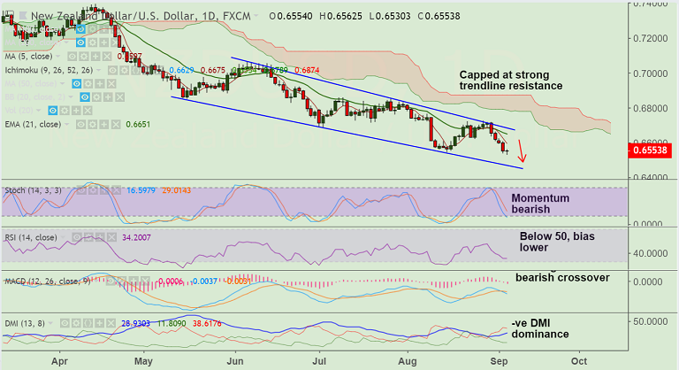 - Major trend in the pair remain bearish. Kiwi bears firmly in control, NZD/USD targets trendline support at 0.6475.