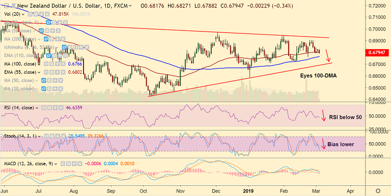 - Break below 55-EMA has raised scope for dip till 100-DMA at 0.6766. Further weakness eyes 200-DMA at 0.6748.