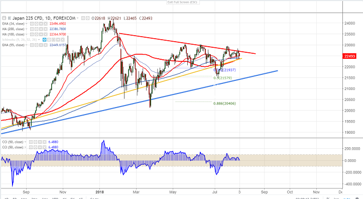Asian markets are trading slightly higher following the trend of wall street. The renewed trade war tensions between US and China is putting pressure on equity markets. US markets closed slightly higher mainly led by tech related stocks. Chinese markets is continuing its weakness and declined more than 6.5% from recent high of 2912.US market has closed slightly lower with Dow Jones at 25326 (0.03% lower) and S&P500 2827 (0.49% higher). USD/JPY which is the main indicator of geo political tension is trading slightly lower on rising trade war tension . US futures is trading flat with Dow Jones at 25315 (0.14% lower) and S&P500 2825 (0.13% lower). Nikkei is currently trading around 22488 0.61% lower.