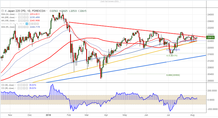 Asian markets trading slightly higher following foot steps of US markets. US markets closed slightly higher on account of better than expected Q2 results. Almost more than 80% of companies in S&P500 posted better than expected corporate earnings. China China reacted to the recent trade tariff by imposing import tariff of $60 billion worth of U.S goods on Friday. Mr Trump threatened to apply tariffs to all $505 billion of Chinese imports. Chinese market halted its weakness and shown a minor of jump of more than 1%. It is currently trading around 2738. US market has closed slightly higher yesterday with Dow Jones at 25502 (0.16% higher) and S&P500 2850 (0.35% higher). USD/JPY which is the main indicator of geo political tension is trading slightly lower on rising trade war tension . US futures is trading flat with Dow Jones at 25533 (0.16% higher) and S&P500 2849 (0.07% higher). Nikkei is currently trading around 22605 0.15% higher as index heavy weight Softbank posted better than expected quarterly results.