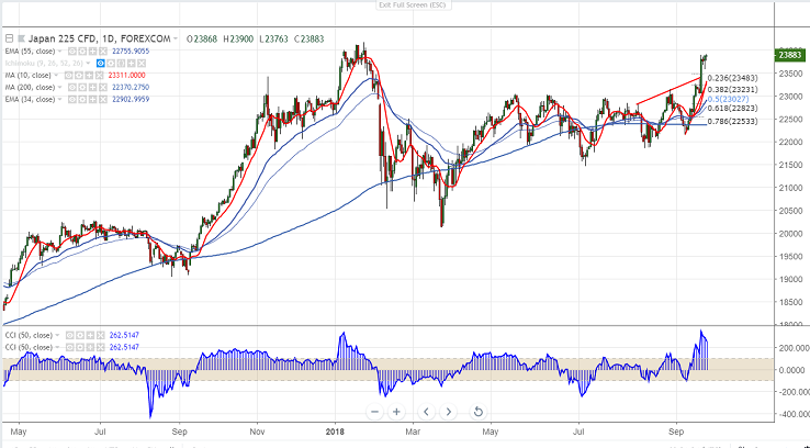 Asian markets is trading stronger with Nikkei trading slightly positive after huge recovery of more than 800 points on account of strong US markets and weak yen. It hits high of 23890 highest level in 8 months .US markets S&P500 and Dow Jones hits all time high yesterday and this shows that investors doesn’t worry much on US and China trade worries. Japan ‘s Nikkei purchasing manager index released today came at 52.9 much better than expected. Shanghai composite is trading flat after a recovery of 100 points from the low of 2644 and is currently trading around 2734(0.18% higher). US markets closed higher with Dow Jones at 26657 (0.95% higher) and S&P500 at 2930 (0.78% higher). US futures are currently trading flat with Dow Jones 26734 (0.07% higher) and S&P500 2935 (0.03% higher). Nikkei is trading around 23835 (0.07% lower).