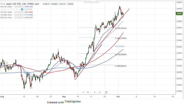 Asian markets is trading slightly lower with Nikkei flat at 0.05% higher. Nikkei hits fresh 27 year high and shown a minor profit booking. The jump was mainly due to easing trade tensions and strong global cues. The uncertainty in Italy has pushed Euro to six week low. The decline in Euro is due to Italian budget deficit of 2.4% GDP. Euro recovered more than 50 pips after Corriere della Sera said that budget deficit will cut by 2% in 2021. US 10 year bond yield has shown a good recovery of more than 2% after minor sell-off till 3.02%. US markets closed mixed with Dow Jones at 26673 (0.46% higher) and S&P500 at 2923.43 (0.36% higher). US futures are currently trading marginally higher with Dow Jones 26854 (0.16% lower) and S&P500 2930 (0.16% higher). Nikkei is trading around 24225 (0.05% higher).