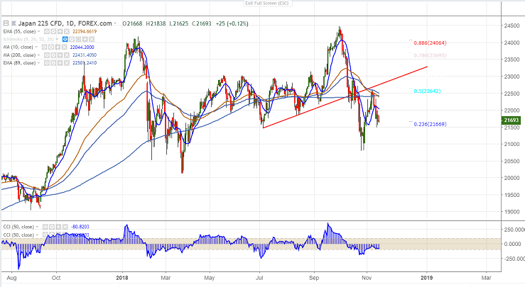 Asian markets is trading slightly weak despite slight improvement in Brexit deal.UK PM Theresa May has got enough support from cabinet minister for her proposed deal. US markets closed lower on account huge sell-off in crude oil prices such as Apple. US futures continues to trade lower with Dow Jones at 25026 (0.30% lower) and S&P500 at 2693 (0.31% lower).Chinese market shanghai holding gains for past four days and is currently trading around 2650 0.60% higher.Nikkei has recovered 200 points from yesterday low of 21558. It is currently trading around 21758 (0.45% higher).