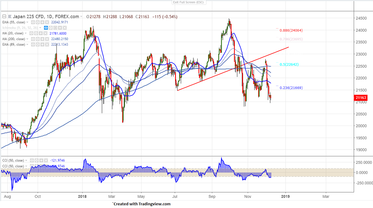 Asian markets is trading mixed with Nikkei declines more than 0.5%. US markets has shown huge come back of more than 2.5% from low with Dow Jones 24423 (0.14% higher), S&P500 2637(0.18% higher).The US 10 year yield shown a minor recovery of nearly 1.5% from low of 2.822%and US 2 year yield is trading on par with US 5 year. Shanghai is trading slightly higher and is currently trading around 2584 (0.91% higher).Nikkei has lost more than 7% from high of 22784 and is currently trading around 21143 (0.53% lower).