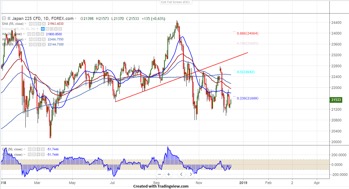 The near term resistance is at 21800 and any break above targets 22000/22217 (89- day EMA)/22500.