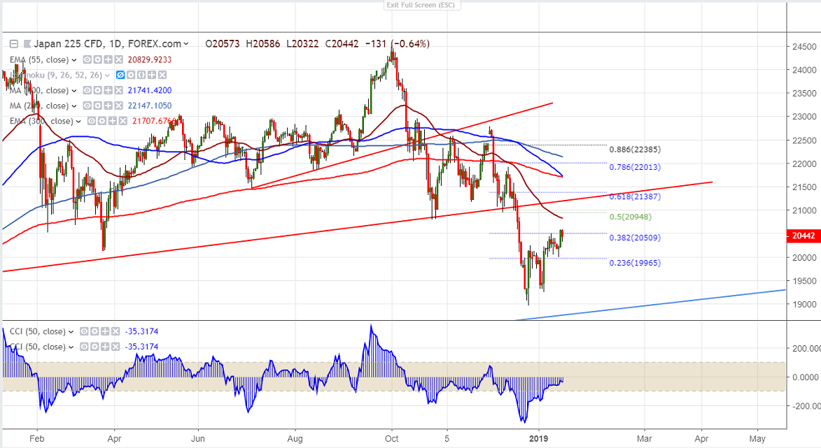 Asian markets are trading mixed especially Nikkei declines more than 0.5% from yesterday’s close of 20576. US markets was closed higher for 10th consecutive days on hopes of US-China trade deal with Dow Jones at 24065 (0.65% higher) and S&P500 2610 (1.07% higher) . Shanghai is trading slightly lower and is currently trading around 2567 (0.10% lower). Nikkei is trading at 20429 (0.70% lower).