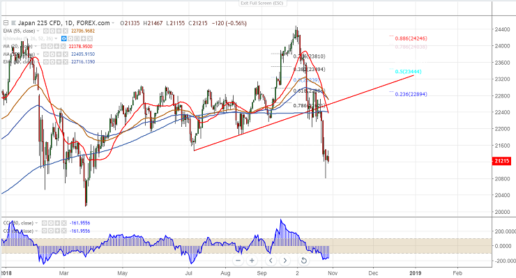 Asian markets trades lower following footsteps of Wallstreet. US markets has closed weak especially NASDAQ declined more than 2%.US futures is trading flat with Dow at 24766 (0.04% lower) and S&P500 2668 (0.08% lower).Chines markets shanghai has lost more than 1% in today’s trade. The index has lost more tahn 60 points from high of 2626. Nikkei has recovered more than 3% from low of 20795. It is currently trading around 21290 (0.17% lower).