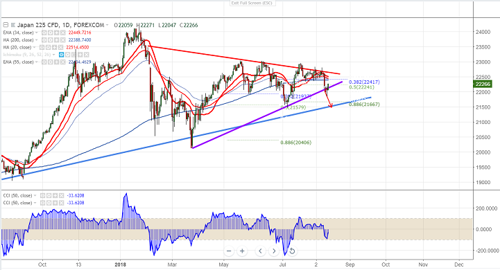 Asian markets are trading weak excluding Nikkei which is trading slightly higher amid weak US markets.Global markets has shown huge selling yesterday after Turkish currency jitters.Turkish lira hits life time low after Donald Trump imposed double tariffs on metal for Turkey. The slight weakness in yen is supporting Nikkei especially export oriented stocks such as Sony and Honda has shown a minor jump of more than 1%. US markets closed slightly lower with Dow Jones 25187 (0.50% lower) and S&P500 2821 (0.40% lower).Shanghai has started to decline after showing a minor recovery till 2806. The index lost more than 0.5% and is currently trading around 2771. USD/JPY which is the main indicator of geo political tension is trading slightly higher after huge decline. US futures is trading flat with Dow Jones at 25275 (0.18% higher) and S&P500 2828 (0.17% higher). Nikkei is currently trading around 21887 1.10% lower.
