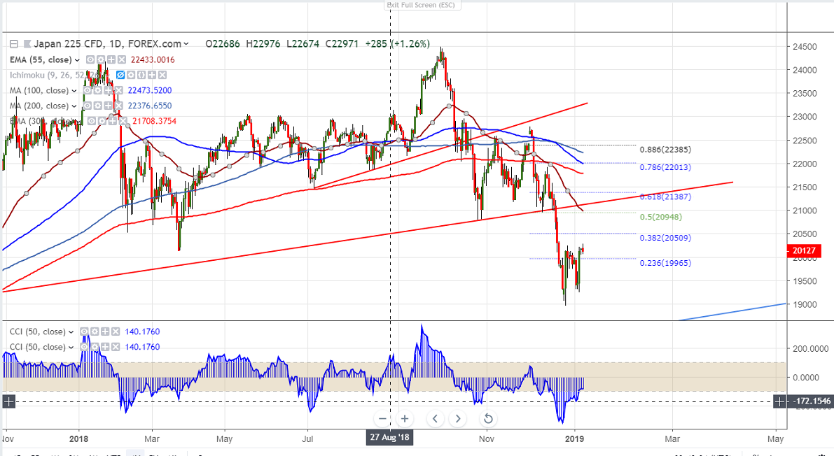 Asian markets are trading strong and jumped more than 2% following footsteps of US markets. US markets has halted its weakness and jumped more than 3% biggest rally since 2011. The jump was mainly due to better than expected US Non farm payroll data and dovish Fed comments. Wall Street closed positively with with Dow Jones at 23433 (3.29% higher) and S&P500 at 2531 (3.43% higher). US economy has added 312000 jobs compared to forecast of 184000 and unemployment rate increased to 3.9% from 3.7%. Shanghai is trading higher and is currently trading around 2525 (0.44% higher). Nikkei has recovered nearly 1000 point from low of 19245 and currently trading around 20115 (0.34% higher).