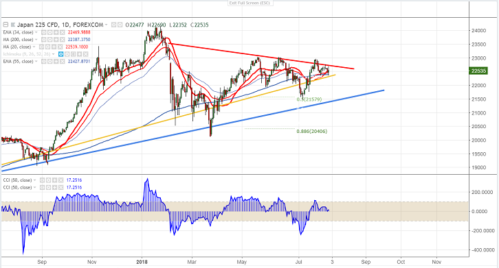 - Asian markets are trading weak excluding Nikkei which has recovered sightly after BOJ monetary policy. US markets has closed lower mainly due to technology stocks. The gains in banks and other sectors was offset by slump in tech stocks.BOJ has kept its interest rates unchanged but added more flexibility to stimulus programme.BOJ has cuts its inflation forecast for year 2018 from 1.3% to 1.1%. BOJ has voted 7-2 on Yield control frame work. According to the Central bank “yields may move upward and downward to some extent mainly depending on developments in economic activity and prices”.US market has closed weak with Dow Jones at 25306 (0.57% lower) and S&P500 2802 (0.58% lower). USD/JPY which is the main indicator of geo political tension is trading slightly higher after BOJ but there was no follow up buying. US futures is trading flat with Dow Jones at 25301 (0.04% higher) and S&P500 2806 (0.04% higher). Nikkei is currently trading around 22555 0.35% higher.