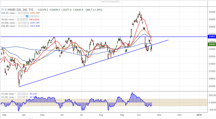 Asian markets is trading higher especially Nikkei trading slightly lower. Nikkei pared most of its loss due to good recovery in Chinese stocks. Shanghai composite jumped more than 4% and recovered more than 150 points from the low of 2506.The geopolitical tensions between US and Saudi, Italy and Brexit are the major factors which is putting pressure on markets. US markets has closed slightly higher with Dow Jones 25444 (0.26% higher) and S&P500 2767 (0.04% lower) .Nikkei has recovered more than 300 points from the low of 22392. It is currently trading around 22653 0.53% higher. US futures is trading slightly higher with Dow at 25480 0.20% higher and S&P500 2770 (0.17% higher).