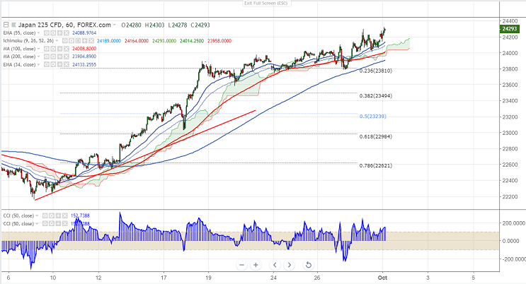 Asian markets especially China and Hong Kong closed for holidays and Nikkei alone jumped more than 0.5% and hits fresh month high. The main reason for rise in Nikkei was due to weakness yen which hits 11 month low against US dollar will support export related sectors. US 10 year bond yield has shown a good recovery of more than 1.5% after minor sell-off till 3.02%. US markets closed flat with Dow Jones at 26263 (0.07% higher) and S&P500 at 2913 (0.00% ). US futures are currently trading higher with Dow Jones 26645 (0.61% higher) and S&P500 2930 (0.52% higher). Nikkei is trading around 24281 (0.41% higher).