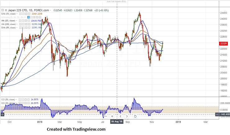 Asian markets is trading higher following footsteps of Wall Street especially Nikkei jumped more than 400 points from low of 22044. US markets was trading higher and jumped more than 2% after Fed Chairman Powell said benchmark interest rate was “just below “neutral level indicates that three year Fed’s tightening cycle is drawing ta close. US 10 year bond yield has shown a minor decline of more than 0.5% and is currently trading around 3.035%.Chinese market Shanghai has shown a recovery of more than 50 points and is trading around 2605 0.12% higher.Nikkei hits high of 22434 and is currently trading around 22336 (0.17% lower).