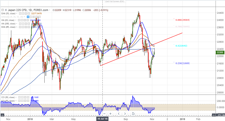 Asian markets trades higher especially Nikkei jumps more than 0.50% on strong Wall Street . Investors awaits US mid term election result. The results are declared for 94 seats out of total 100 seats in Senate republican leads 51% and in house democrats lead 178out of 435. US markets closed higher with Dow Jones more than 0.5% .US futures is trading flat with Dow at 25765 (0.31% higher) and S&P500 2766 (0.29% higher).Chinese market shanghai continues to trade slightly higher and jumped more than nearly 0.2% higher and is trading around 2663 0.18% higher.Nikkei has jumped more than 1000 points from low of 20800 made on Oct 29th . It is currently trading around 22240 (0.27% higher).