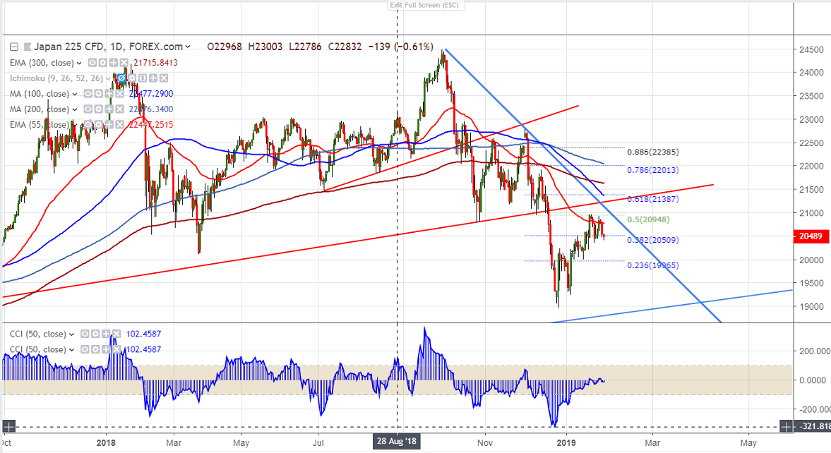 Asian markets are trading weak especially Nikkei declined slightly as US filed criminal charges against China’s Huawei.US markets has closed weak with Dow Jones 24528 (0.84% lower) and S&P500 2643 (0.78% lower) after weaker set of earnings from Caterpillar and Nvidia. Chinese Shanghai composite is trading slightly lower and is currently trading around 2583 (0.50% higher). Markets eye US Fed meeting and progress in US-China trade talks for further upside. USDJPY has once declined after hitting high of 109.95 and any break above 110 confirms further bullishness.It is currently trading around 109.21.