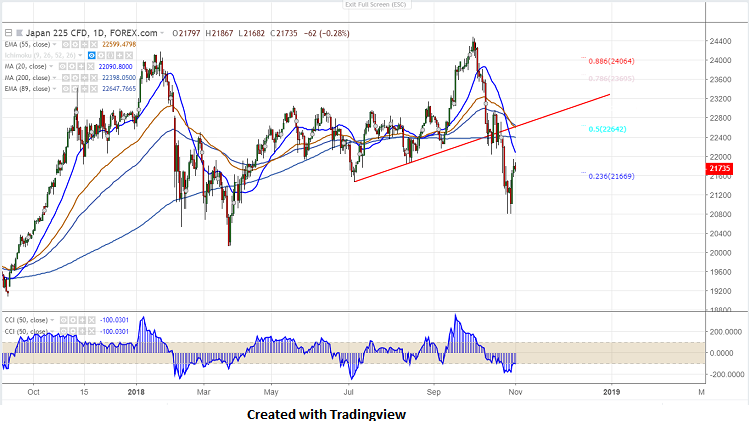 Asian markets trades mixed especially Nikkei is trading slightly weak on weak earnings outlook from NTT Docomo . Wall street has closed higher especially NASDAQ Do Jones jumped more than 2% on better than expected Facebook earnings US futures is trading higher with Dow at 25190 (0.40% higher) and S&P500 2718 (0.44% higher).Chinese market shanghai is trading higher on hopes on stimulus by Chinese government as manufacturing slows. It is trading around 2632 1.13% higher.Nikkei has declined slightly as communication sector tanks more than 6.8% more than 1000 points from low of 20800. It is currently trading around 21770 (0.57% higher).