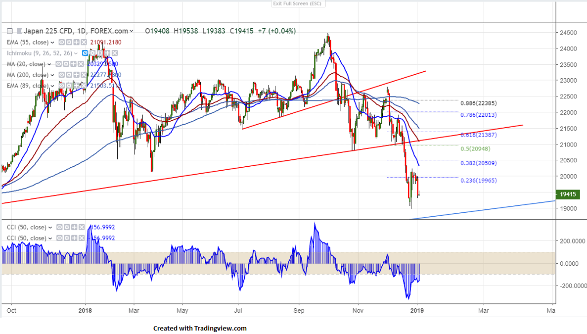Asian markets are trading weak especially Nikkei on stronger yen.The yen soared sharply and hits lowest level since Mar 2018 after Apple cuts its revenue forecast citing sluggish iPhone sales in China.US markets recovered sharply more than 2.5% and closed with Dow Jones at 23346 (0.08% higher) and S&P500 at 2510 .Shanghai is trading flat and is currently trading around 2464 (0.05% higher). Nikkei is trading slightly lower currently trading around 19405 (1.40% lower).