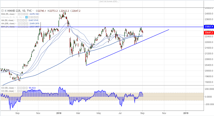 Asian markets are trading lower on trade tensions between US and Canada and unstable EM currencies weighed on global stock market. US and Canada to meet once again this week to continue negotiations on trade talks which has ended up without any major deal previous week.US President Donald Trump has threatened on Sat that it would terminate the NAFTA if congress intervene. Chinese Caxin/Markit purchase manufacturing index came at lowest level in a year. US futures are currently trading slightly lower with Dow Jones 25982 (0.10% lower) and S&P500 2903 (0.11% higher). Nikkei is trading around 22643 (0.28% lower).