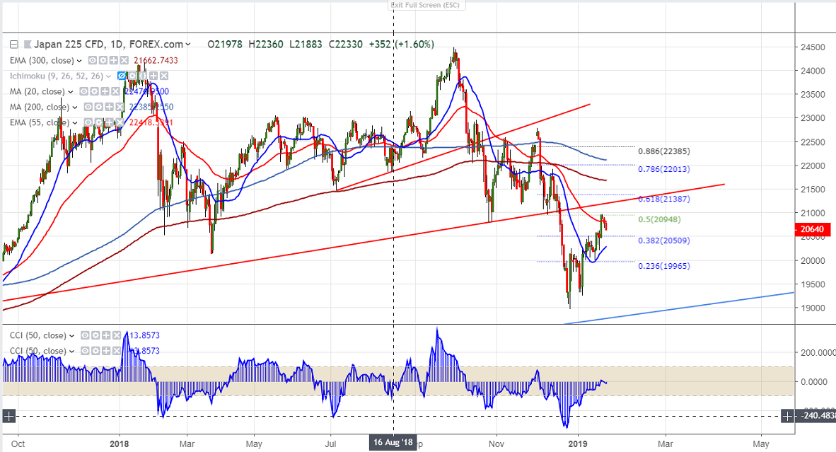 Asian markets are trading lower especially Nikkei lost nearly 300 points from high on global growth concerns.IMF cuts global growth forecast on account of trade war between US and China and Brexit uncertainty. It has lowered estimates for growth in 2019 by 0.2% to 3.5% and 3.6% in 2020.US markets was shut yesterday on account of Martin Luther king Jr.US futures is trading slightly lower with Dow Jones 24555 (0.33% lower) and S&P500 2654 (0.33% lower) . Shanghai is trading lower and is currently trading around 2569 (0.71% lower). Nikkei is trading weak for third consecutive day and is currently trading at 20 (0.95% lower).