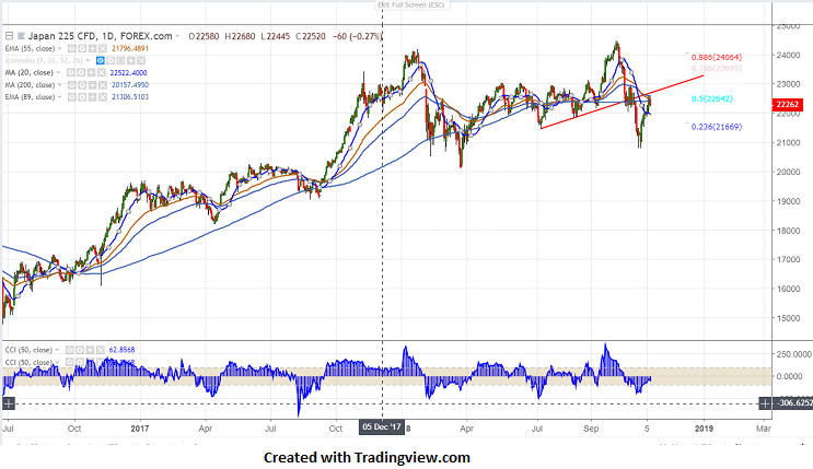 Asian markets is trading lower after hawkish fed policy meeting. Fed has kept its interest rate unchanged and maintains it hawkish guidance . The central was optimistic on US economy ,jobs growth and inflation is near Fed’s 2% target. According to CMIE group’s FedWatch tool , the likelihood of the Fed raising rates by 25 bpbs in Dec is 75%. US markets closed flat with Dow Jones at 26191 (0.04%higher) and S&P500 at 2806 (0.25% lower).Chinese market shanghai is trading weak and lost almost 1% lower and is trading around 2610 0.97% lower.Nikkei has lost more than 350 points from high 22585. It is currently trading around 22255 (0.89% lower).