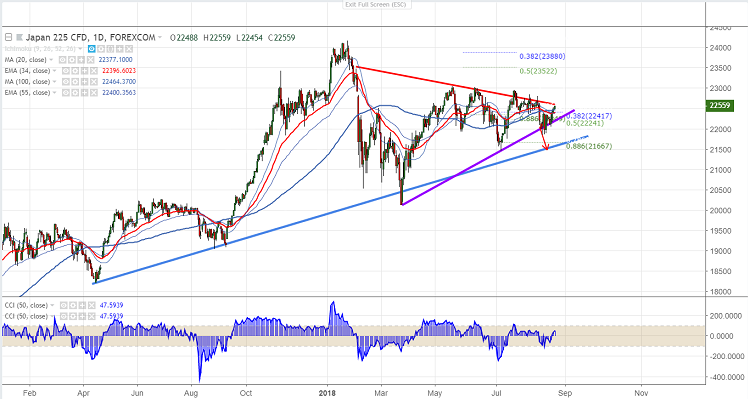 Asian markets are trading lower following footsteps of US markets. US markets drifted lower after the U.S and China imposed tariffs of $16 bn in each others goods . Trade talks between US and China has concluded on Thursday with no major developments. Markets eye Fed chairman Powell speech at Jacksonhole symposium today for further direction. Shanghai is slightly consolidating after hitting high of 2739 and is currently trading around 2713. US dollar has halted its weakness and jumped almost 60 pips from the low of 94.93.US markets closed slightly weaker with Dow Jones 25657 (0.30% lower) and S&P500 2856 (0.17% lower). US futures is trading marginally higher with Dow Jones at 25698 (0.12% higher) and S&P500 2859 (0.13% higher). Nikkei is currently trading around 225 0.57% higher.